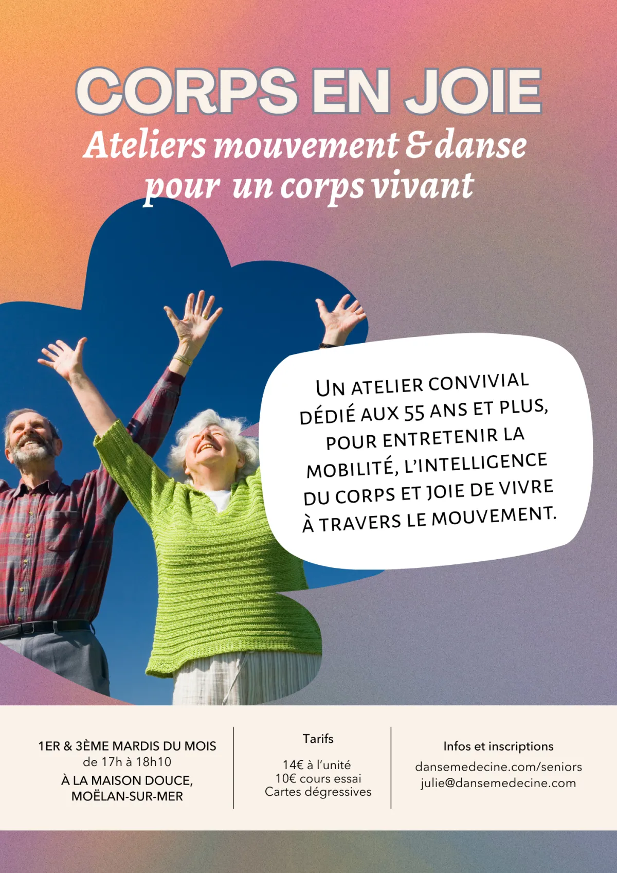 Un atelier convivial de 1h15 dédié aux 55 ans et plus, pour entretenir la mobilité, l’intelligence du corps et joie de vivre à travers le mouvement.